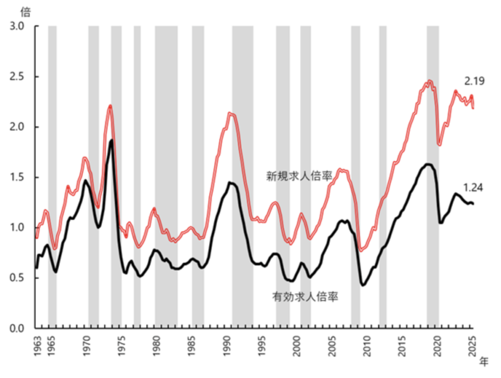 2026年2月時点での有効求人倍率は1.19倍新規求人倍率は2.10倍と非常に高い水準です(参照:厚生労働省)